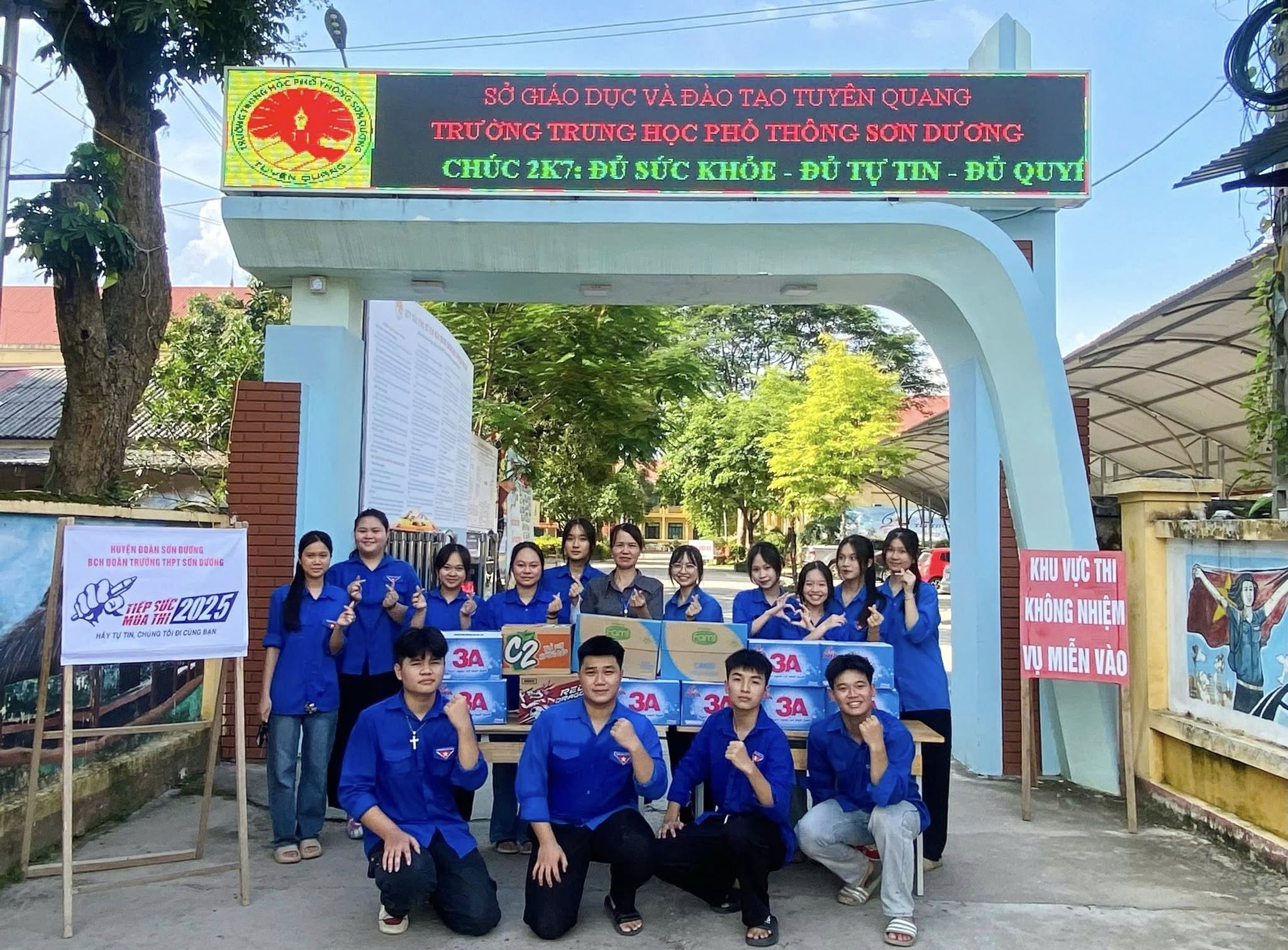 Đội hình thanh niên tình nguyện tiếp sức mùa thi năm 2025 tại điểm thi trường THPT Sơn Dương