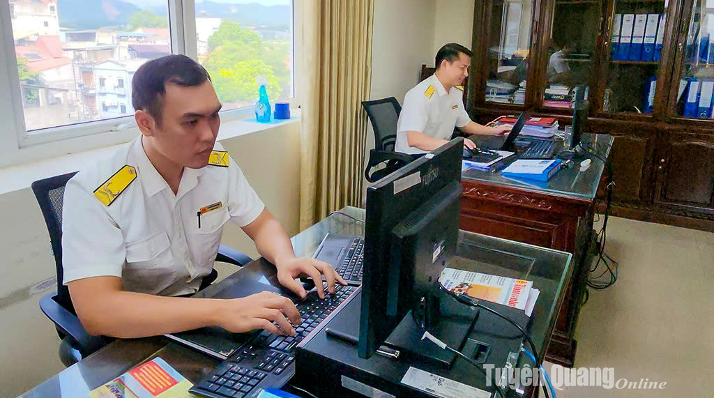 Cán bộ Chi cục Thuế khu vực VII - địa bàn tỉnh Tuyên Quang áp dụng chuyển đổi số vào hoạt động quản lý thuế.