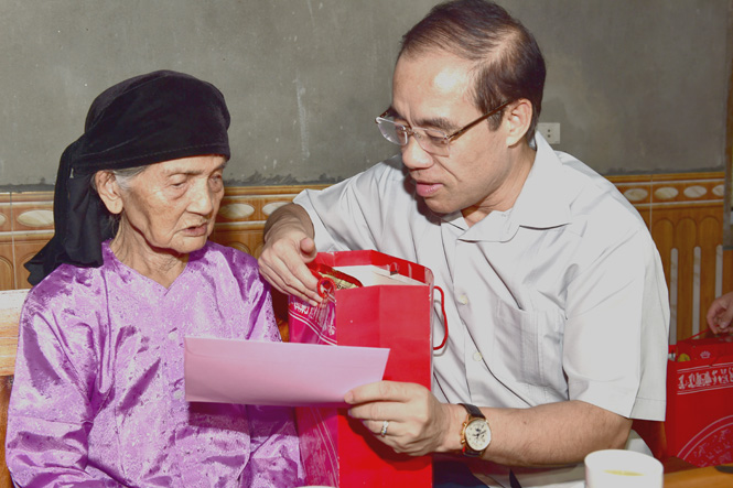 Đồng chí Bí thư Tỉnh ủy Chẩu Văn Lâm tặng quà cụ Phạm Đình Ngạc, thôn Khuôn Bén.
