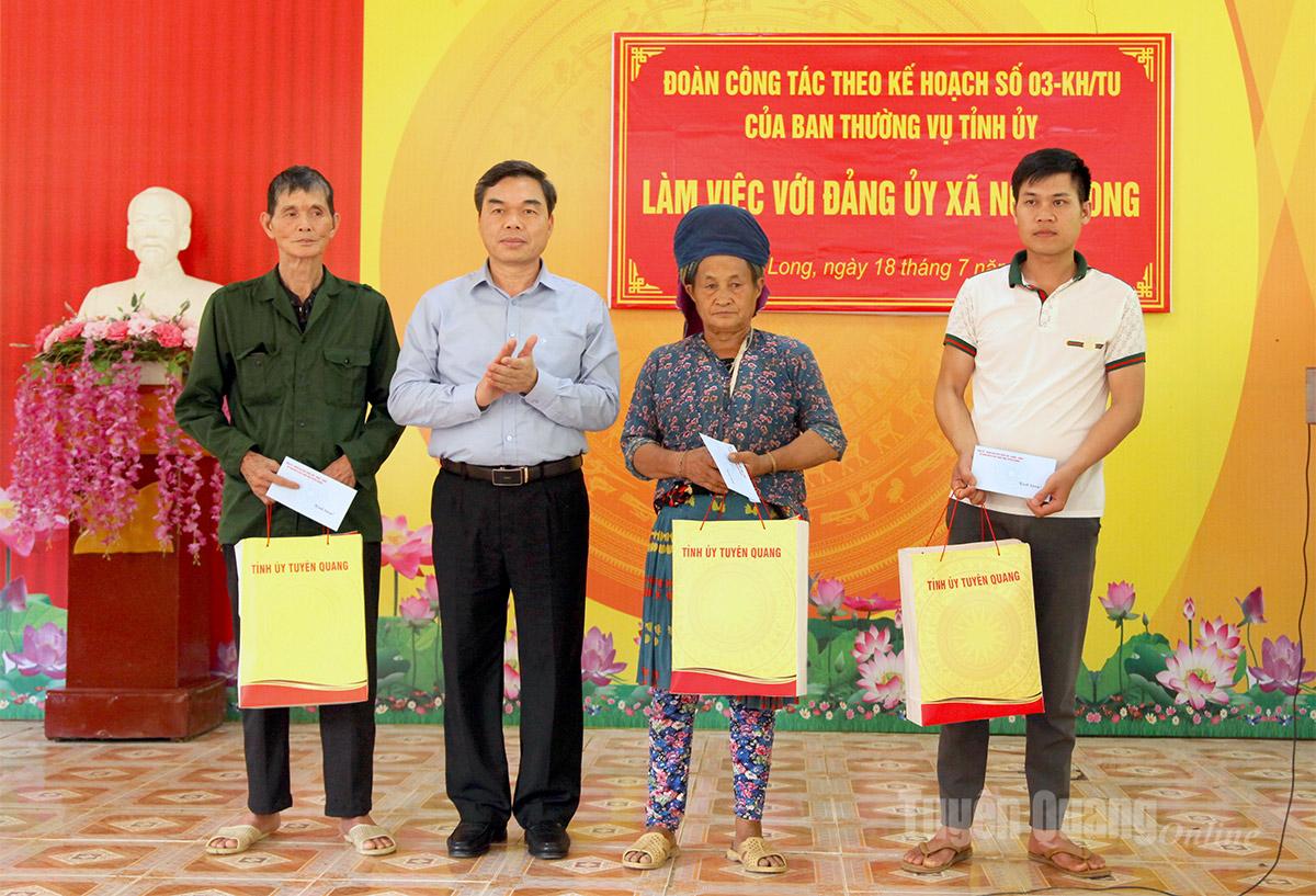 Đồng chí Phó Bí thư Tỉnh ủy Ma Thế Hồng tặng quà cho 3 gia đình cựu chiến binh xã Ngọc Long.
