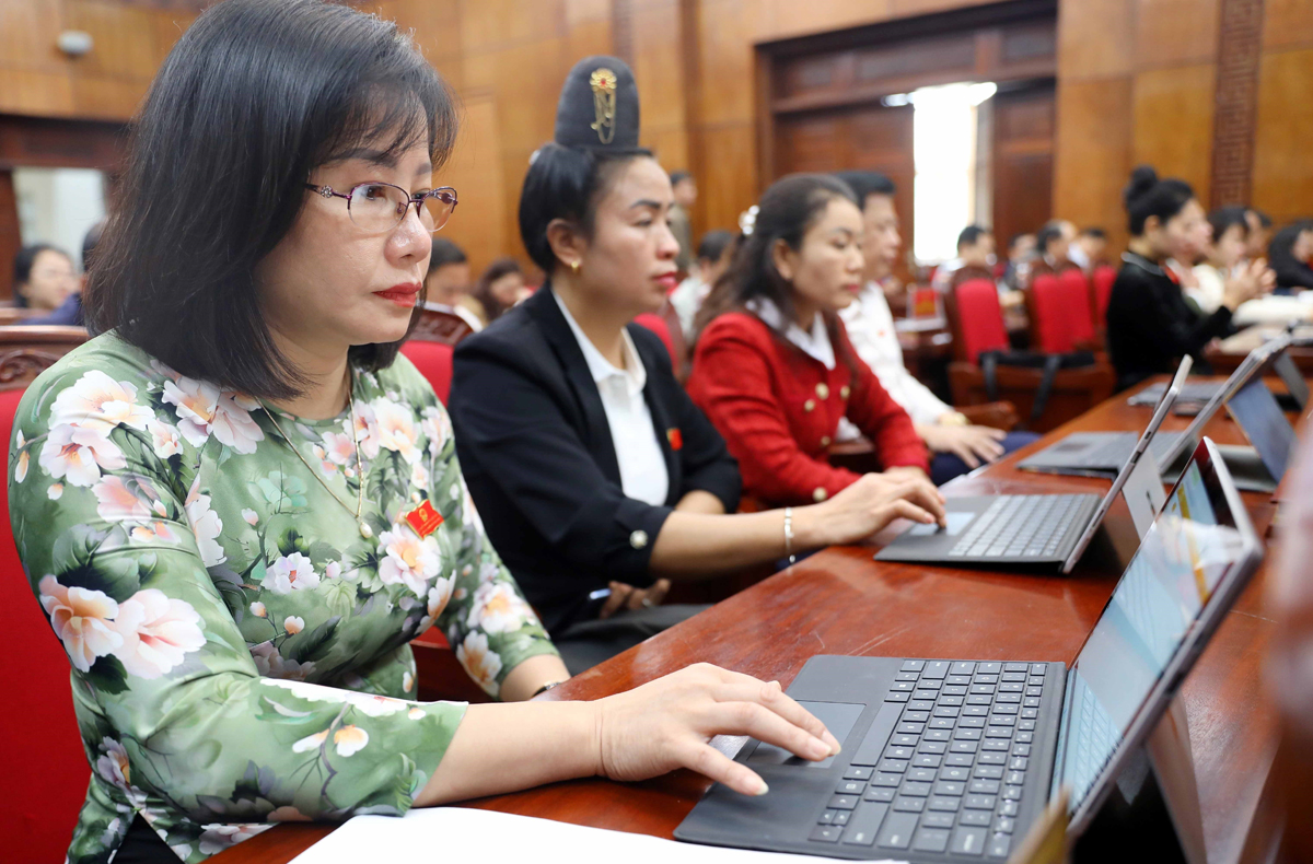 Các nữ đại biểu bấm nút thông qua Nghị quyết tại Kỳ họp thứ 18, Hội đồng nhân dân tỉnh Điện Biên khóa XV_Ảnh: TTXVN