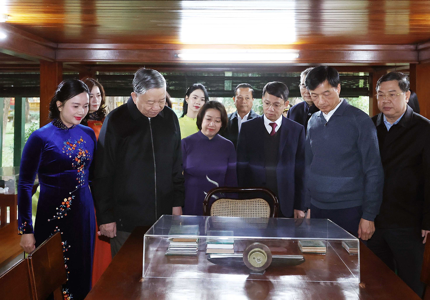 Tổng Bí thư Tô Lâm và các đại biểu xem tài liệu, hiện vật được trưng bày tại di tích Nhà sàn Bác Hồ_Ảnh: TTXVN
